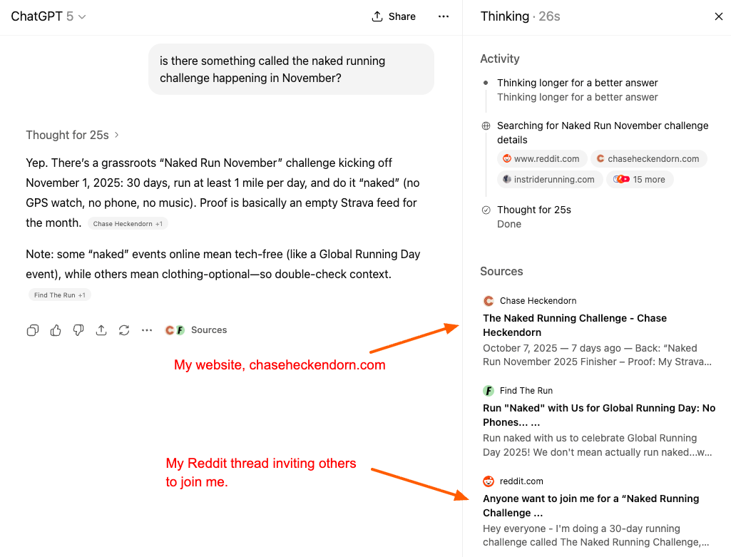 ChatGPT cited my website and even the Reddit thread – the two places where I’d published the idea. Within a week, an AI model was already referencing something that didn’t exist on the internet until I created it.